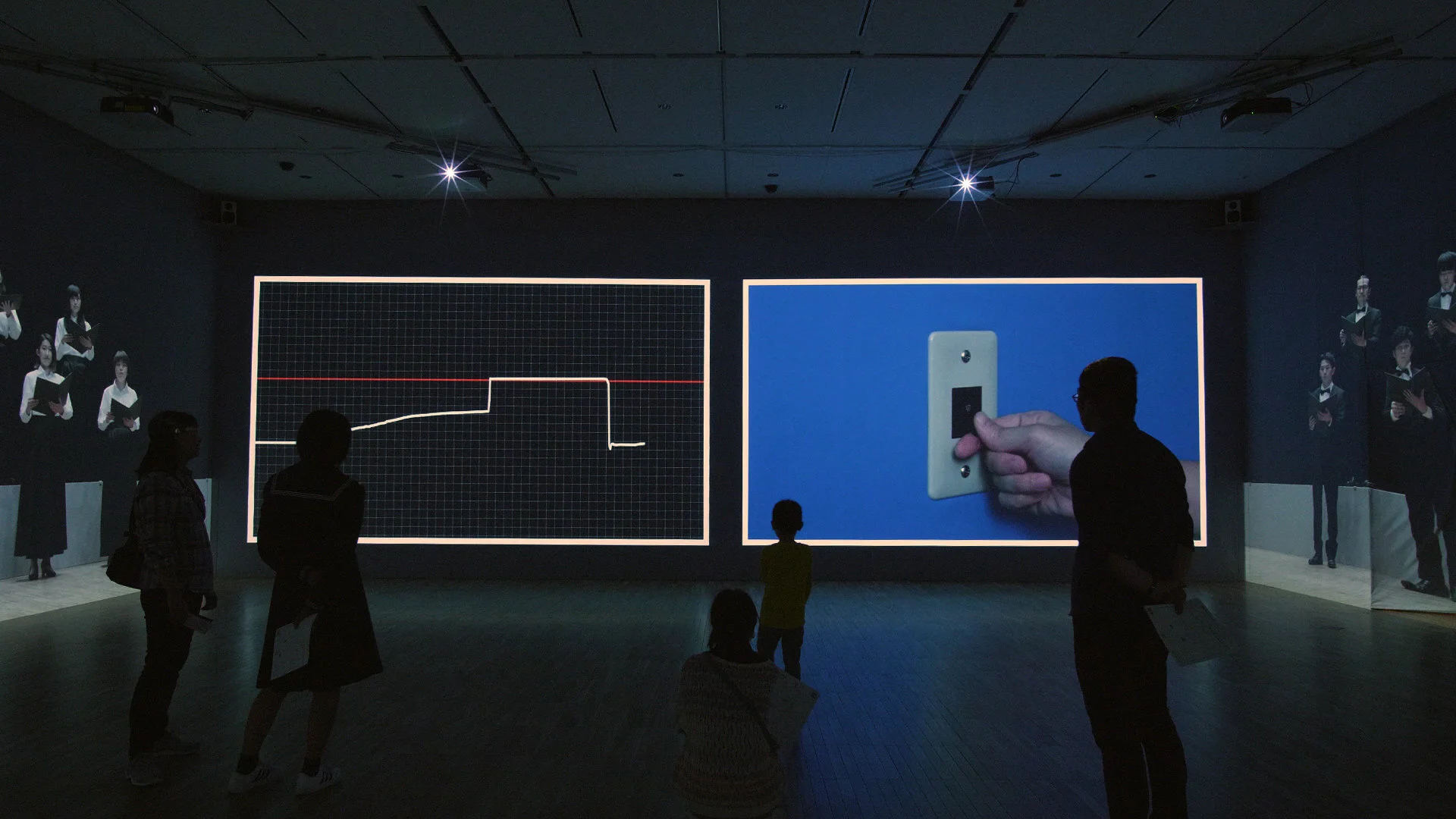 しきい値の遷移の可視化の様子を、60人の合唱団に囲まれて体感できる部屋。